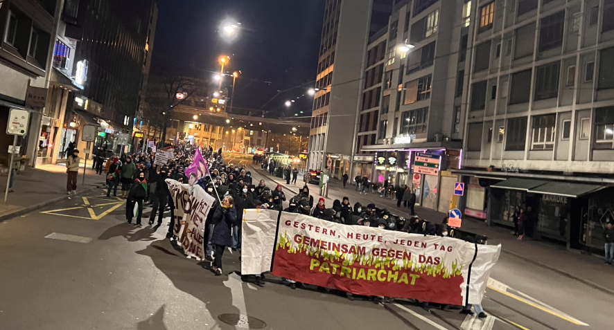 8 Mart’ta İsviçre’nin Basel kentinde kadınlar “Devlete, savaşa ve ataerkiye karşı” (Kein staat, kein krieg, kein patriarchat) “Sokağa, eyleme” çağrısıyla tren garı önündeki De Wette parkında buluştu.