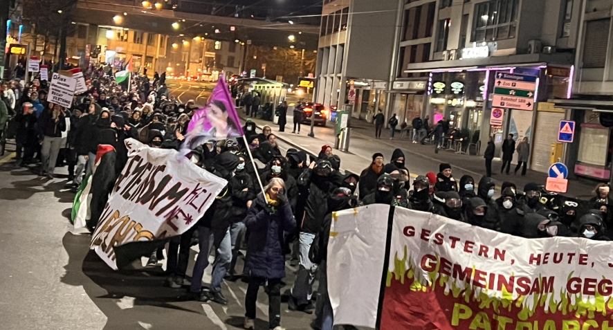 Miting ve yürüyüş izni alınmamıştı. Kadınlar, “Sokaklar bizim. Kimseden icazet istemiyoruz” diyerek, polisin “gelin izin alın” “davetini” reddettiler. Saat 18.30’dan itibaren toplanmanın başladığı eylemde devlete, savaşa ve ataerkiye karşı Almanca ve İngilizce sloganlar atıldı. Eylemde genç kadınlar çoğunluğu oluştursa da az sayıda erkekte katıldı. Geniş “güvenlik” önlemleri alan polis, yürüyüş başlamadan önce şunu ifade etti ve yürüyüş rotası dayattı: