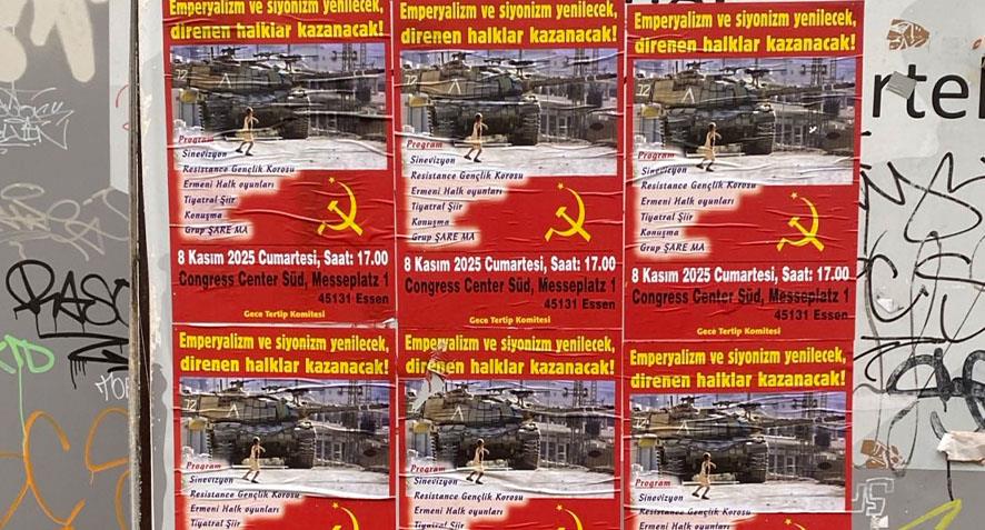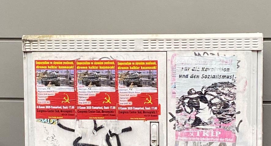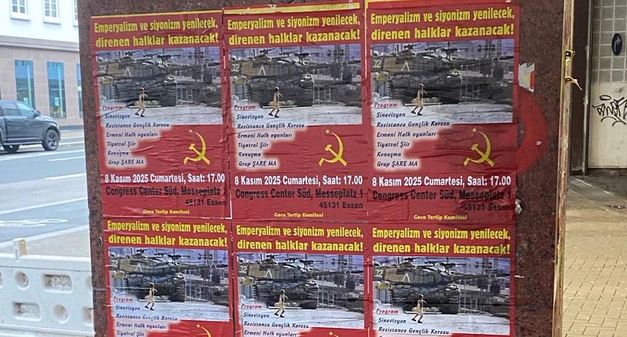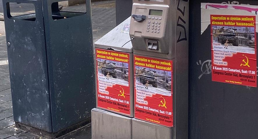 Çağrı için kullanılan gece afişinde “Emperyalizm ve siyonizm yenilecek, direnen halklar kazanacak!” şiarı, gece programı ve orak-çekiç amblemi yer alıyor. Geceye çağrı afişi Bielefeld’in merkezi noktaları, kent meydanı ve pazar yerinde yaygın bir şekilde asıldı. Benzer içerikte başka afişler olmadığında, gece afişleri daha çok dikkat çekiyor.