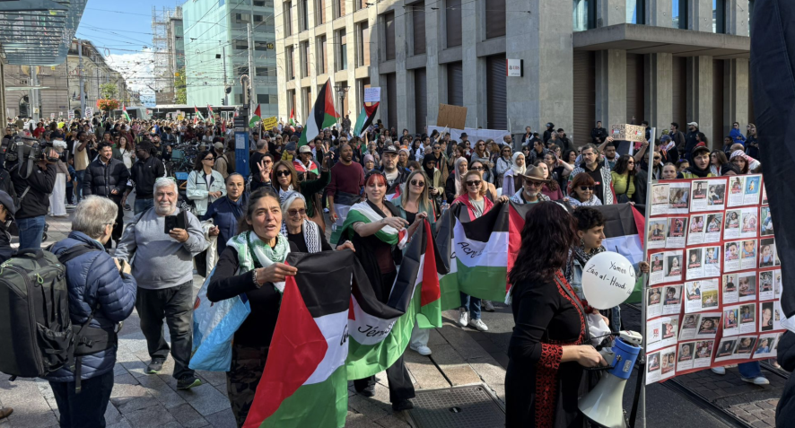 Parc des Bastions Meydanı’nda toplanan binlerce kişi, yapılan konuşmalarla İsviçre devletinin ve emperyalist güçlerin ikiyüzlü politikalarını teşhir etti. Konuşmalarda, siyonist barbarlığın derhal durdurulması ve Filistin halkıyla dayanışmanın büyütülmesi çağrıları yapıldı.