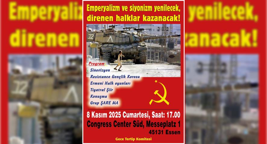 8 Kasım’da Essen kentinde düzenlenecek merkezi gece etkinliğine hazırlık çalışmaları sürüyor. “Emperyalizm ve siyonizm yenilecek, direnen halklar kazanacak!” şiarlı etkinliğe çağrı çalışmaları Dortmund ve Hamm kentlerinde de yapılıyor.