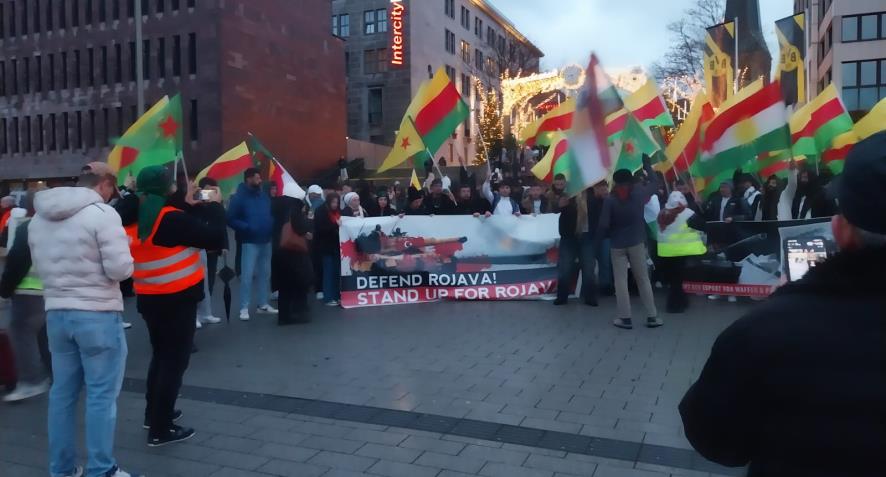 Mitingte “Biji berğwedana Rojava!”, “Biji berğwedana YPG!”, “Jin Jiyan Azadi!”, “Mörder Erdoğan!” sloganları atıldı.