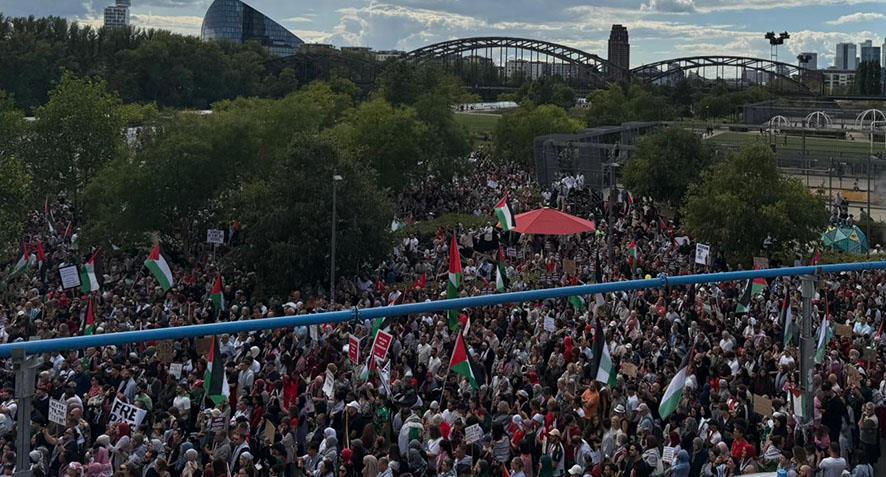 Soykırımcı Siyonistlere destek veren ve Filistin halkına düşmanlıkta başı çeken Almanya’da da sokak eylemleri engellenemiyor. Bu çerçevede 30 Ağustos Cumartesi günü Frankfurt kentinde yapılan eyleme binlerce kişi katıldı.