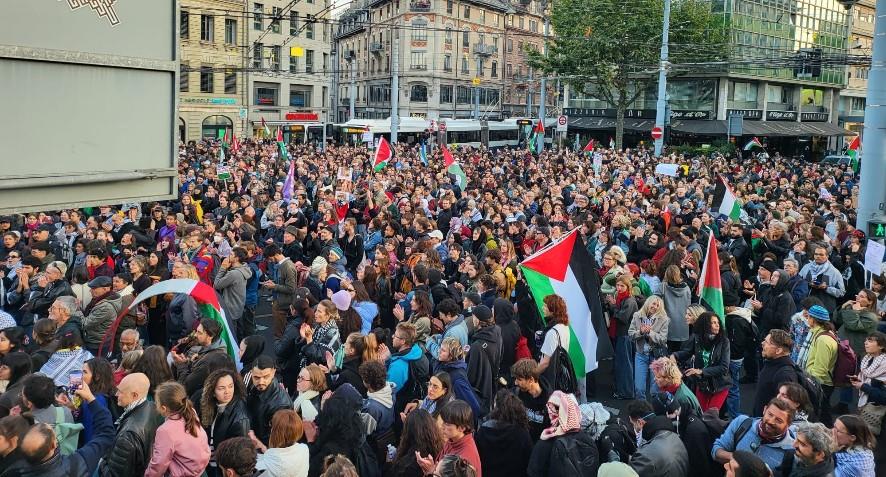 Cenevre kentinde yapılan eyleme binlerce kişi katıldı. Kitlenin Garé Cornavin önünde toplanmasının ardından yürüyüşe geçildi. Yürüyüş boyunca “Filistin halkıyız, Filistin çocuklarıyız!” , “Terörist, katil, faşist İsrail!” , “İsviçre sermayesi katlediyor!”, “Nehirden, denize Özgür Filistin!” sloganları haykırıldı. Mont Blanc köprüsüne ulaşan kitle burada polisin vahşi saldırısına uğradı. Aralarında çocukların da bulunduğu kitleye yoğun gaz ve tazyikli su sıkarak saldıran polisle yoğun çatışmalar yaşandı. Ardından İsviçre devletinin iki yüzlü politikaları teşhir edilerek eylem sonlandırıldı.