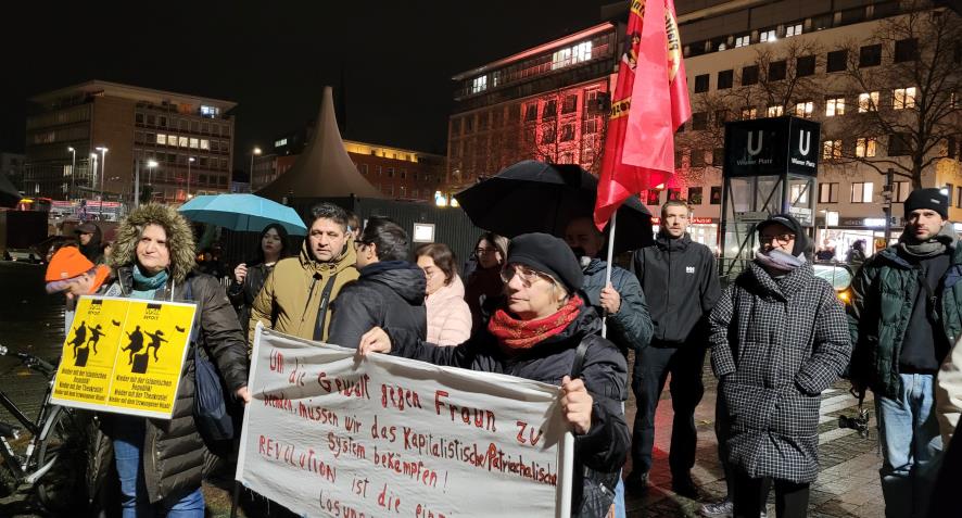 Miting alanında ve ardından yürüyüş boyunca konuşmalar yapıldı. Örgüt ve gruplar adına yapılan konuşmalarda kapitalizmin krizi, kadınlara yönelik şiddetin sözde kadın erkek eşitliğinin olduğu algılanan Almanya'da da yoğun olarak yaşandığını, yeni açıklanan verilere kadın cinayetlerinin, ev içi şiddetin, cinsel tacizin arttığını, Almanya Kriminal Dairesi’nin birkaç gün önce yaptığı açıklamaya göre Almanya'da 2023 yılında her gün bir kadının katledildiğine değinildi. Filistin'de, Lübnan'da, Siyonistlerin sürdürdüğü soykırımcı politikalarının ürünü olarak siyonistlerin sürdürdüğü savaşlar başta olmak üzere dünyanın birçok yerinde süren savaşlardan en fazla kadın ve çocukların zarar gördüğüne, faşizmin kadını bir kez daha mutfak ve çocuk odasına hapsetmeye çalıştığın ifade edildi. Şiddet mağduru kadınların sığınacağı sığınma evlerinin yetersizliğine, dikkat çeken konuşmacılar, Alman hükümetinin bütçede buralara ayıracak “para olmadığı“ açıklamasına karşın, savaşa ve silahlanmaya milyarlarca Euro bütçe ayırdığını eleştirdiler.