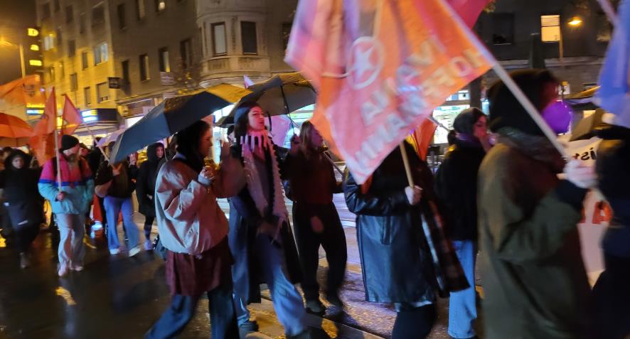 Yürüyüş kolu göçmenlerin özellikle Türkiyeli ve Kürt esnafın bulunduğu kalabalık bir sokaktan geçerken Türkçe konuşmalar yapıldı. Yürüyüşte “Kadın cinayetlerine, faşizme ve savaşa karşı, insanlık dışı sığınmacı politikalarına karşı örgütlü mücadele!”, ”Şiddete ve sermayeye karşı enternasyonal kadın mücadelesi!”, “Faşizme ve patriarkal şiddete karşı mücadele!” şiarlarının yer aldığı pankartlar taşındı.