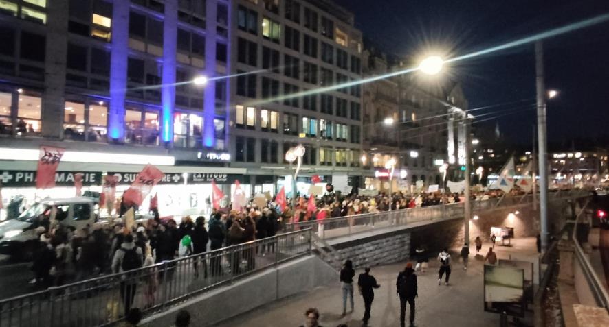 Yürüyüş saat 18’de başlayarak, Bel-Air köprüsünden, Riponne Meydanı’ndan ve oradan da Belediye Meclisi’ne, Şatoya yapıldı. 10 bin kişinin katıldığı eylemde büyük coşku hakimdi. Kortejin başında “Tam endeksleme” yazılı ortak pankart ile kortej boyu birçok döviz ve farklı sektörlerin pankartları taşındı. Eylem boyunca “Grev grev grev ve endeksleme, budur çözüm!”, “Grev grev grev ve eylem budur çözüm!”, “Bir tek çözüm endeksleme”, “Belediye Meclisi, yeterince konuştunuz, hesap doğru değil!” sloganları atılıp, Belediye Meclisi’ni teşhir eden bir şarkı söylendi.