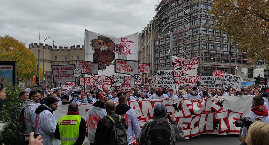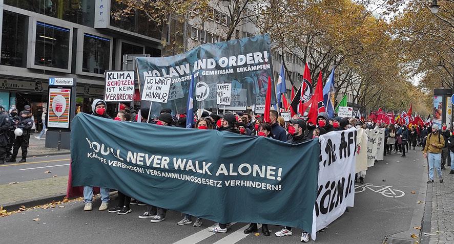Kentin Neumarkt ve Heumarkt gibi merkezi yerleri ile Ren nehri üzerindeki bir köprüden geçerek Kalk-Bürgerpark’a uzanan uzun yürüyüş güzergahı boyunca kortejlerdeki coşku ve canlılık hiç azalmadı. Yerli ve göçmen çok çeşitli grupların pankart, bayrak, flama ve dövizleriyle yer aldıkları yürüyüşte, “Yaşasın enternasyonal dayanışma”, “A, anti, anti kapitalista”, “Alerta alerta antifascista” gibi bilinen sloganların yanı sıra, “Toplanma yasasını durdurun” “Bugün bunu ciddiye almayanlar yarın izleneceklerdir”, “İstediğimiz gibi eylem yaparız - denetime ve kontrollere karşı”, “Devlet ve Naziler el ele, cevabımız direniş” gibi, yasayla ilgili sloganlar da sıklıkla atıldı. Çevrede kalabalıkların biriktiği yerlerde konuyla ilgili ajitasyonlar gerçekleştirildi, bildiri, broşür vs. dağıtıldı.