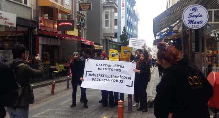 Bir başka sokakta ise “Uzaktan eğitim istemiyoruz! Üniversitelerimizden vazgeçmiyoruz!” yazılı pankartla toplananlar yürüyüş gerçekleştirdi. “Eğitim haktır, gasp edilemez” ve “deprem değil bu bir katliam” sloganları atan öğrenciler polis ablukasına alındı. Polis işkencesine “insanlık onuru işkenceyi yenecek” sloganları ile karşılık verildi. Saldırı sırasında 4’ü Devrimci Gençlik Birliği’nden olmak üzere çok sayıda kişi gözaltına alındı. Polis saldırısına çevrede bulunanlar da “Korku dağları sarmış bir basın açıklamasına bu kadar polis gelir mi?” diyerek tepki gösterdi.