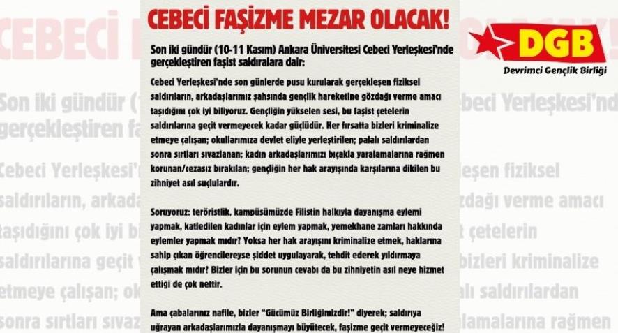 "Bizler Hacettepe öğrencileri olarak okulumuzda "kabadayılık" yapıp, tesbih sallayıp, geçen sene kar maskesiyle yurt odası basıp öğrenciye saldırıp çenesini kıran, öğrencileri takip eden, kadınları taciz eden, meşru öğrenci haklarını savunan insanlara saldıran ve kendileri hariç her hak arayışını terörize eden, okulumuzda torbacılık yapan, geçmişte de okul hocamız Bedrettin Cömert'i katleden bu çeteyi okulumuzda barındırmayacağız. Eli kanlı faşist çetelere karşı kampüsümüzü savunuyoruz."