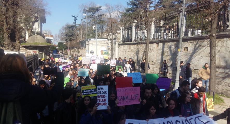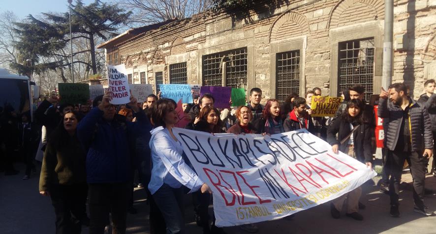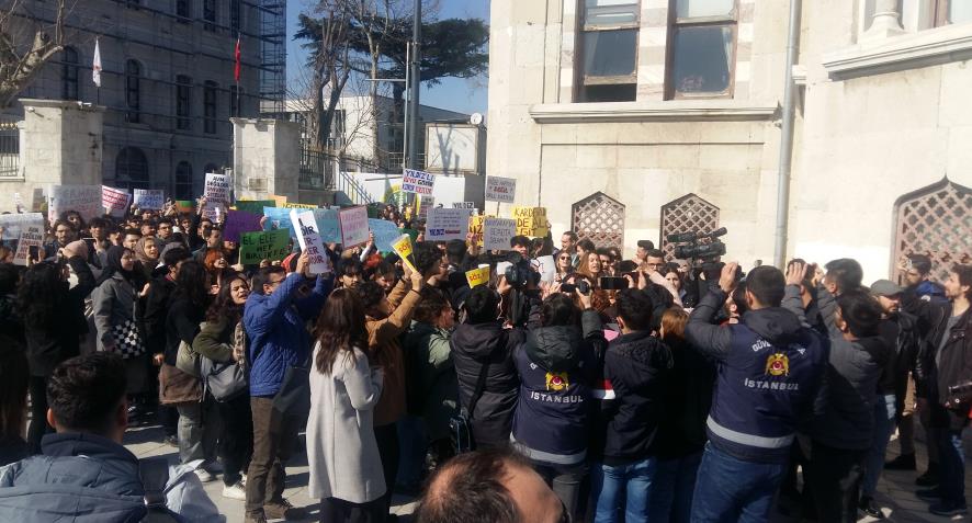 Çeşitli üniversitelerden öğrencilerin de katıldığı eylem saat 14.00’da Vezneciler Metro durağından İÜ Beyazıt Ana kapı önüne yürüyüş ile başladı. Yürüyüş boyunca öğrenciler “Burası üniversite, AVM değil” sloganı ile kararı protesto etti. Eylemin saatler öncesinde ise İÜ Beyazıt yerleşkesi adeta polis ablukasına alındı. Yürüyüş yapan öğrenciler Ana kapıya ulaştığında polis açıklamanın kapı önünde değil, merdivenlerde yapılması dayatmasında bulundu. Öğrenciler dayatmayı kabul etmeyerek Ana kapı önüne gitti.