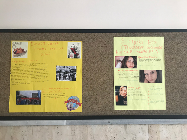 İÜ Cerrahpaşa Teknik Bilimler Meslek Yüksekokulu’nda ise panolara 8 Mart köşesi yapıldı. Hazırlanan 8 Mart köşesinde “Doğru bildiğimiz yanlışlar” denilerek 8 Mart’ın hediyelerin alındığı basit bir gün olmadığı, tarihinde binlerce kadın işçinin vermiş olduğu mücadele olduğu anlatıldı. Ayrıca aylardır direnen Flormar işçileri de selamlandı. Hazırlanan bir başka köşede, katledilen üniversite öğrencileri Özgecan Aslan, Şule Çet ve lise öğrencisi Helin Palandöken’e değinilerek verilerle kadın cinayetlerindeki tırmanışa dikkat çekildi.