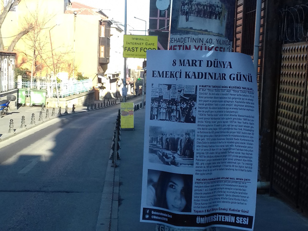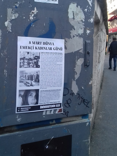 Üniversitenin Sesi de 8 Mart Dünya Emekçi Kadınlar Günü’nün ön günlerinde hazırladığı duvar gazetesi ile gençliğe seslendi. İstanbul Üniversitesi’nin çevresine yapıştırılan 8 Mart konulu duvar gazetesinde, 8 Mart’ın ortaya çıkış tarihi anlatılırken, günümüzde 8 Mart’ın içinin boşaltıldığı, kadınlara hediye alındığı gün olarak kutlandığı bir gün olarak görüldüğü “doğru bildiğimiz yanlışlar” ifade edildi. 1800’lü yıllarda kadın işçilerin verdikleri mücadeleler sonucu kazanılan bu günün, 1910 yılında Uluslararası Sosyalist Kadın Konferansı’nda Clara Zetkin’in önerisiyle bir mücadele günü olarak kabul edildiği anlatıldı. Konferanstan bir yıl sonra 25 Mart 1911’de Triangle Gömlek Fabrikası’nda çıkan yangında 129’u kadın 146 işçi katledildiği, tarihsel olarak bazı kaynaklarda 1857’de olduğunu söylese de yangının, 1911 yılında gerçekleştiği belirtildi. Daha sonra 16 Aralık 1977’de Birleşmiş Milletler Genel Kurulu’nun, 8 Mart’ı “Kadınlar Günü” olarak kabul ederek bu günün tarihsel ve sınıfsal önemini silmek istediği ifade edildi.