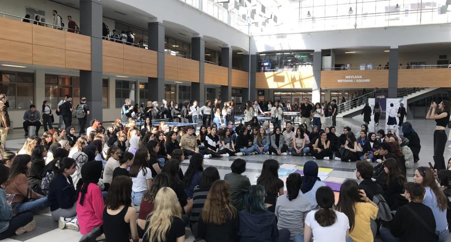 Teknik Bilimler Meslek Yüksekokulu önünde buluşan öğrenciler “Katledilen kadınlar isyanımızdır!” pankartıyla Büyükçekmece yerleşkesinin orta noktası Mevlana Meydanı’na sloganlarla yürüdü. Mevlana Meydanı’na gelen öğrenciler pankartı astı ve ardından kısa bir konuşma yaptı. Yapılan konuşmada şu ifadeler kullanıldı: