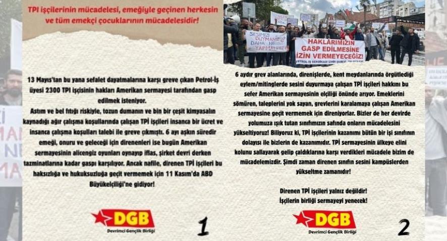 6 aydır grev alanlarında, direnişlerde, kent meydanlarında örgütlediği eylem/mitinglerde sesini duyurmaya çalışan TPI işçileri hakkını bu sefer Amerikan sermayesinin elçiliği önünde arıyor. Emeklerini sömüren, taleplerini yok sayan, grevlerini karalamaya çalışan Amerikan sermayesine geçit vermemek için direniyorlar. Bizler de her devirde yolumuza ışık tutan sınıfımızın safında onların mücadelesini yükseltiyoruz! Biliyoruz ki, TPI işçilerinin kazanımı bütün bir işçi sınıfının dolayısı ile bizlerin de kazanımıdır. TPI sermayesinin ülkeye elini kolunu sallayarak gelip çaldıklarına karşı verdikleri mücadele bizim de mücadelemizdir. Şimdi zaman direnen sınıfın sesini kampüslerden yükseltme zamanıdır!