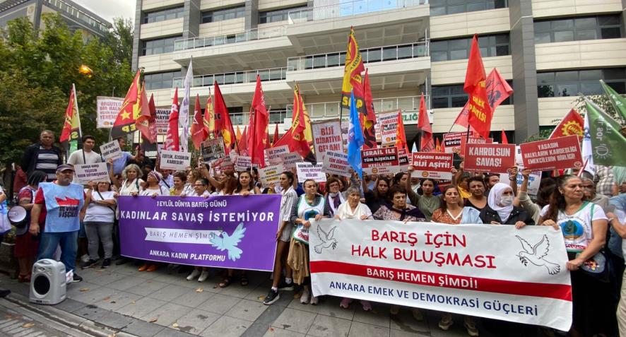 Ankara’da 1 Eylül Dünya Barış Günü’nde Sakarya’da eylem yapıldı. İnsan Hakları Anıtı’nda toplanan kadınlar alana barış zinciri kurarak ve sloganlarla yürüdü.