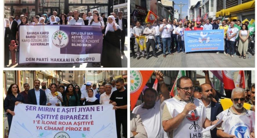 Hakkari merkezde DEM Parti önünde basın açıklaması yapıldı. Eylemde DEM Parti Hakkari İl Eşbaşkanı Kadir Şahin konuştu.