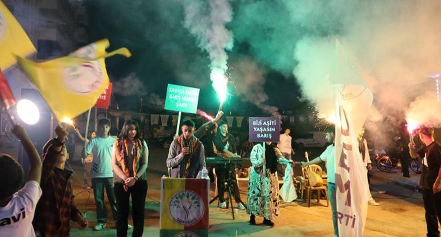Mezopotamya Ajansı’nda yer alan habere göre, miting alanında DEM Parti Urfa Gençlik Meclisi “Aşitî azadî her bijî Serokatî” yazılı pankartla yürüyüş yaparken kadınlar "Jin pêşengên aştî û civaka demokratîkin" pankartıyla yürüdü.