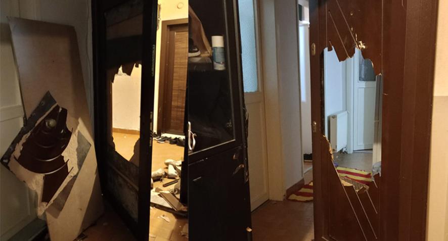 Kaldıraç'ın paylaştığı görüntülerde Gazi Mahallesi'nde okurlarının evlerine yapılan baskında, polis kapıyı duvardan söktü ve polisin "Kafanıza sıkarız kımıldamayın" dediği ifade edildi.