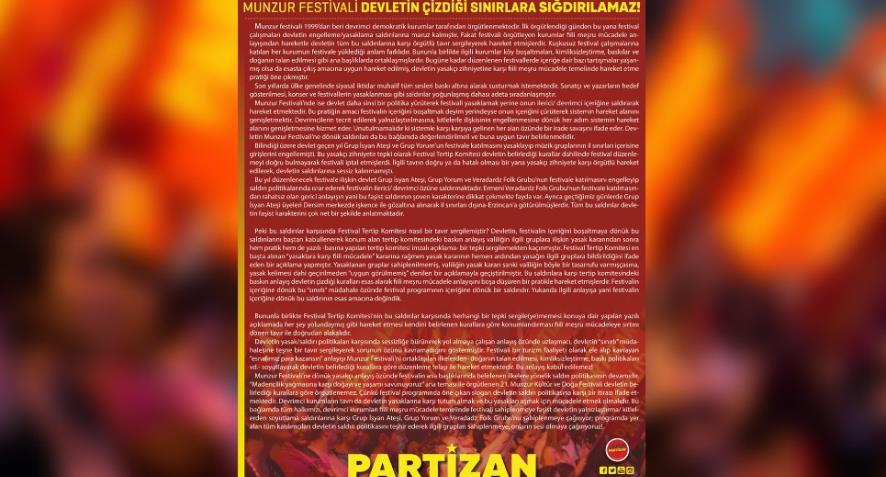 Dersim'de bugün başlayan 22. Munzur Festivali öncesi valilikten yasak kararı geldi. Tunceli Valiliği, festival öncesi kentte 5 gün süreyle açık alanlarda toplanma, yürüyüş ve basın açıklaması gibi eylemlerin izne bağlandığını duyurdu.