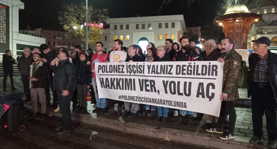 Bursa’da ise Sehrekustu Meydanı’nda (Fomara) “Polonez işçisi yalnız değildir, Hakkımı ver, yolu aç” pankartı açıldı.