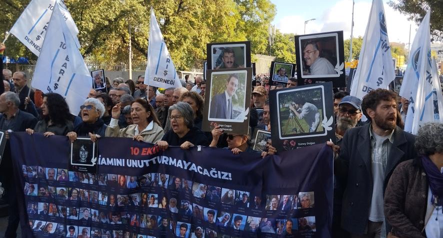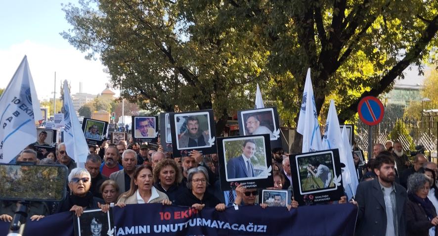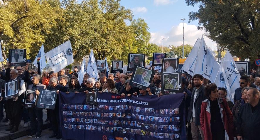 "Türkiye'nin 81 ilinden DİSK, KESK, TMMOB, TTB Emek, Barış ve Demokrasi Mitingi için Ankara'ya gelen on binlerce insan tam 10 yıl önce bu noktadaydı. IŞİD'in kan gölüne çevirdiği alanda 104 insan yaşamını yitirirken, 500'e yakın insan da bedenen ve ruhen yaralandı. Geriye kalan bizler için hiçbir şey eskisi gibi olmadı. Tam 10 yıldır içtiğimiz suyun, yediğimiz yemeğin tadı aynı değil; soluduğumuz hava ciğerlerimizi yakıyor. Türkiye tarihinin en büyük sivil katliamında kaybettiğimiz evlatlarımızı, annelerimizi, babalarımızı, eşlerimizi, arkadaşlarımızı, yoldaşlarımızı ve en sevdiklerimizi 10’uncu yılında, 120’nci ayında sevgi, saygı ve özlemle anıyoruz.”