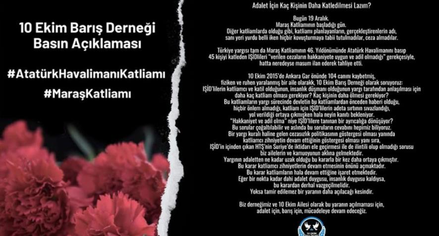 Açıklama, “Bu toprakları katliamlarla, faili meçhul cinayetlerle anılmaktan çıkarıp barış ve demokrasiyle taçlandırarak yitirdiğimiz canlarımıza, yoldaşlarımıza, karanfillerimize armağan edeceğiz. Er ya da geç, sorumlular cezalandırılacak; emek kazanacak, demokrasi kazanacak, barış kazanacak!” sözleriyle sona erdi.