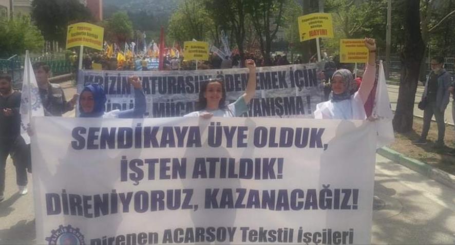 Acarsoy Tekstil işçileri “Sendikaya üye olduk, işten atıldık. Direniyoruz, Kazanacağız!” pankartıyla mitinge katılım sağladı.