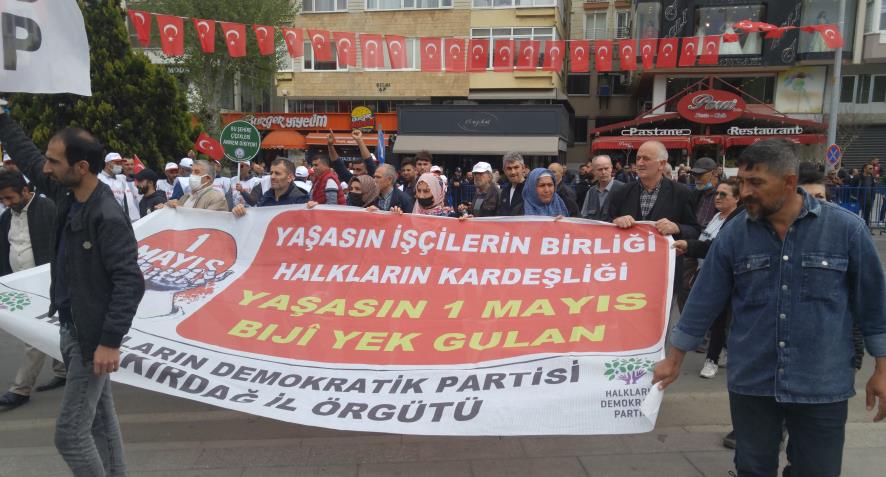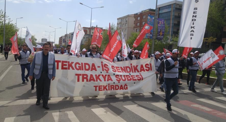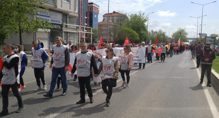 Saat 10.00’da toplanma alanında bulunan işçi ve emekçiler kortejler oluşturarak, sloganlarla yürüyüş gerçekleştirdi. En önde kitlesel katılımı ile Belediye-İş yer alırken, ardından Tek Gıda-İş ve Harb-İş sendikaları yürüdü. Ardından ise Trakya EYT, Tekstil ve Metal İşçileri Birliği, HDP, EMEP kortejler oluşturarak yürüdü. Yoğun polis ablukası altında gerçekleşen yürüyüş miting alanında toplanmalar ile bitirilerek, programa geçildi.