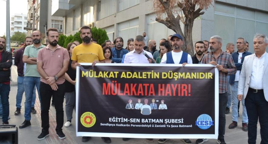 Mardin'de Eğitim Sen Kızıltepe Şubesi çocuklara yönelik polis şiddetine tepki gösteren şube yöneticileri Kadir Demir’in Trabzon’a sürgün edilmesini protesto etti.