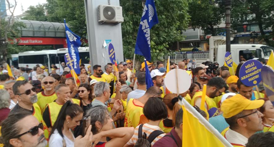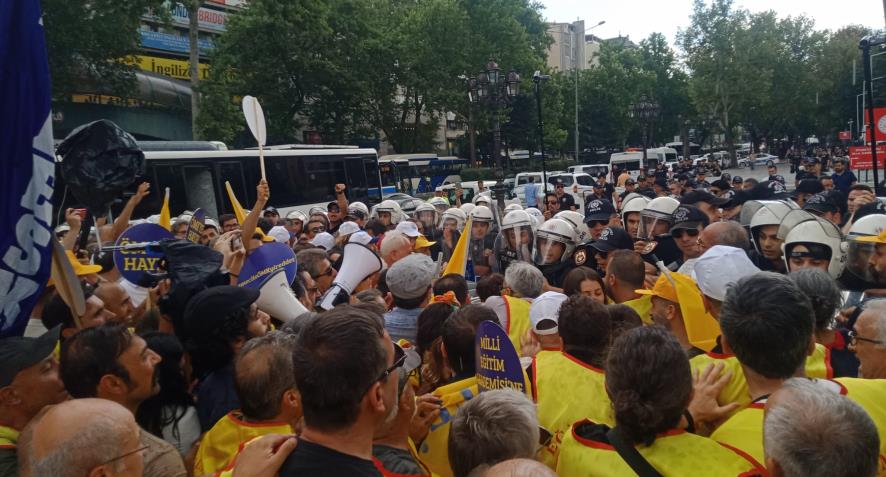 "Çocuklarımızı tarikat yuvalarına mahkum etmek istiyorlar. Buna itiraz edeceğimiz için bu barikatı kuruyorlar. Suçlular hesabını verecekler. Eğitim emekçilerinin hiçbir sorununu çözmüyor meslek kanunu. Bunu duymak istemiyorlar. Öğretmenleri sefalet ücrete mahkum ediyorlar. Eğitimin niteliğini boşalttılar. Patronlar ve tarikatlarla eğitim düzeni oluşturuyorlar."