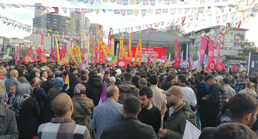 Kürt emekçilerin yoğun olarak katılım sağladığı mitingde SODAP, ESP, Partizan ve CHP de flamalarıyla yer aldı.