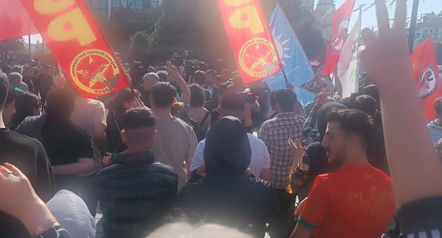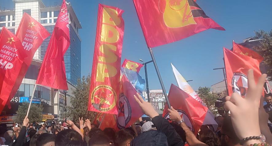 DEM Parti’nin çağrısıyla gerçekleşen mitinge BDSP, Kaldıraç, Yeni Dünya İçin Çağrı, PDD, ESP, SMİ, TİP, TÖP, SODAP, EMEP, Komün, EHP flamalarıyla katılım sağladılar. Kürsüden mitinge destek veren kurumlar anons edilerek selamlandılar.