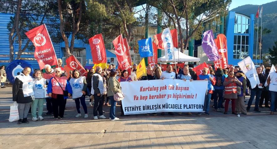 Fethiye Birleşik Mücadele Platformu'nun çağrısıyla saat 18.00'de Fethiye Kültür Merkezi (FKM) önünde iki ayrı basın açıklaması gerçekleştirildi.