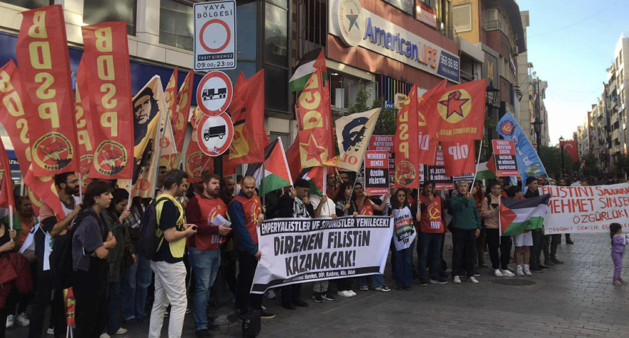 Aralarında BDSP’nin de bulunduğu ilerici ve devrimci kurumların çağrısıyla Karşıyaka İzban’da buluşuldu “Emperyalistler ve Siyonistler yenilecek! Direnen Filistin kazanacak!” yazılı pankartla İş Bankası önüne yürüyüş yapıldı. Yürüyüş boyunca yapılan konuşmalarda İsrail’in saldırganlığı teşhir edilerek Filistin halkının direnişi aktarıldı. Konuşmalar sırasında Filistin için eyleme katıldığı için “Cumhurbaşkanına hakaret” gerekçesiyle tutuklanan Mehmet Şimşek ile dayanışma çağrısı yapıldı.