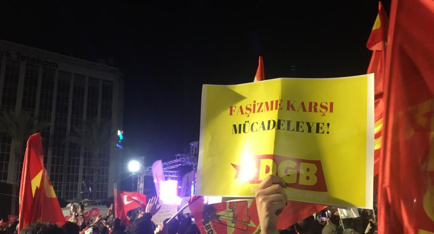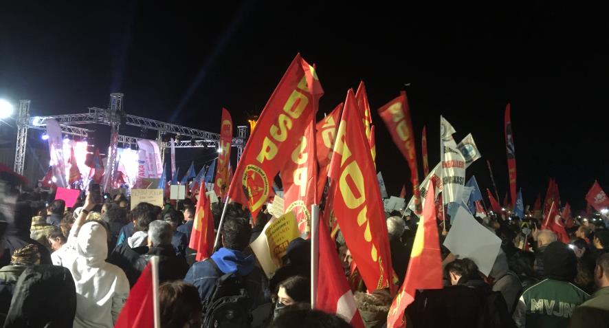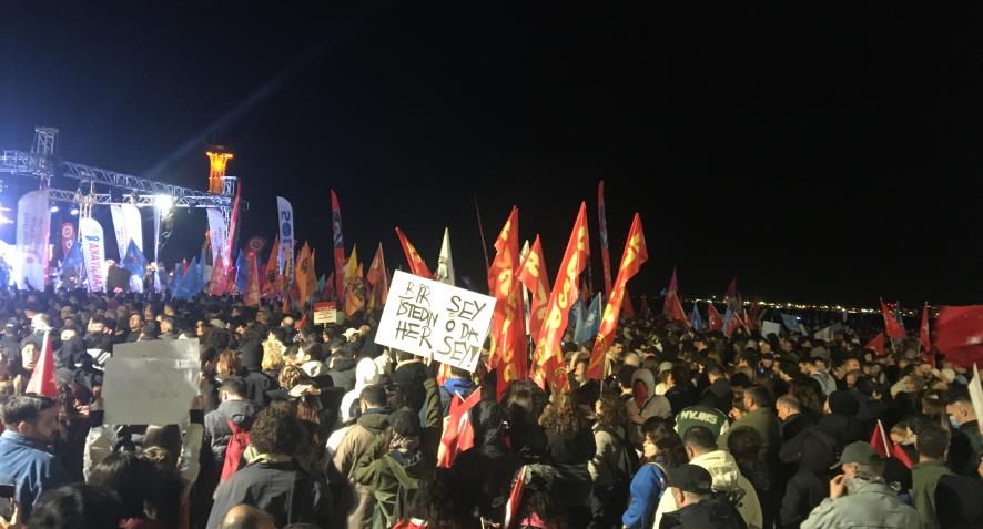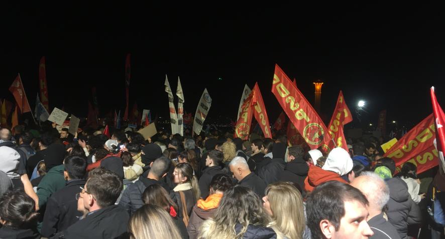 Eylemlerin üçüncü gününde yasak ilan edilmesine rağmen İzmir’de gençlik ve emekçiler direnmeye devam ediyor. Dün (21 Mart) gözaltı saldırısı ve bugün (22 Mart) ev baskınlarının ardından onbinlerce kişi Lozan Meydanı’nda toplandı. Cumhuriyet Meydanı’na yürüyüş yapılıyor. Lozan Meydanı’nda kürsü kuruldu ve gözaltılara, faşist baskı ve teröre tepki gösterildi.
