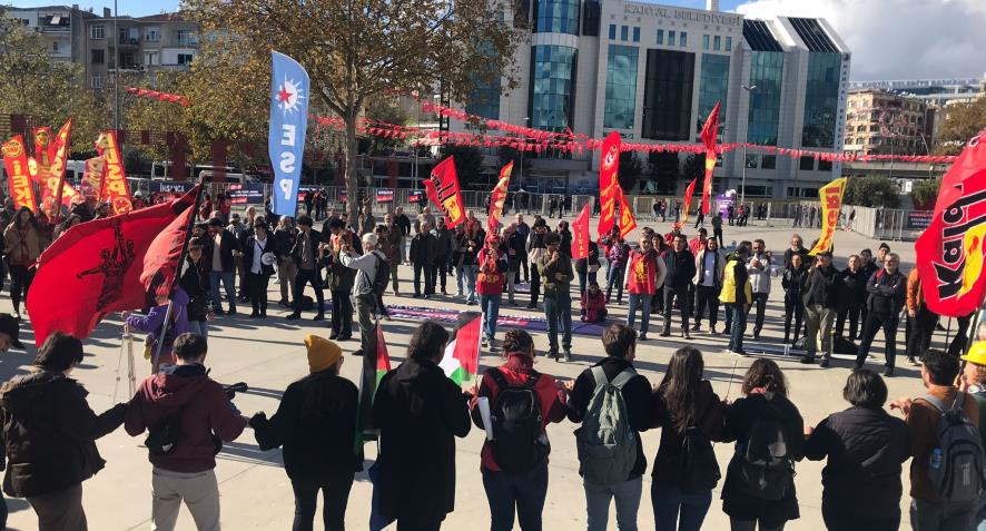 Mitingde söz alan BDS temsilcisi işçilerin haklarını gasp eden firmaların İsrail’in savaş sanayisini büyüttüğüne dikkat çekerek “İşçilerin hak mücadelesi ile Filistin halkının mücadelesi ortaktır” dedi. Konuşmada Filistinli sendikaların boykot çağrısı aktarılarak “Filistin davası geçmişte kalmış bir dava değildir. Filistin anti-emperyalist anti-kapitalist mücadelenin bir cephesidir” denildi.