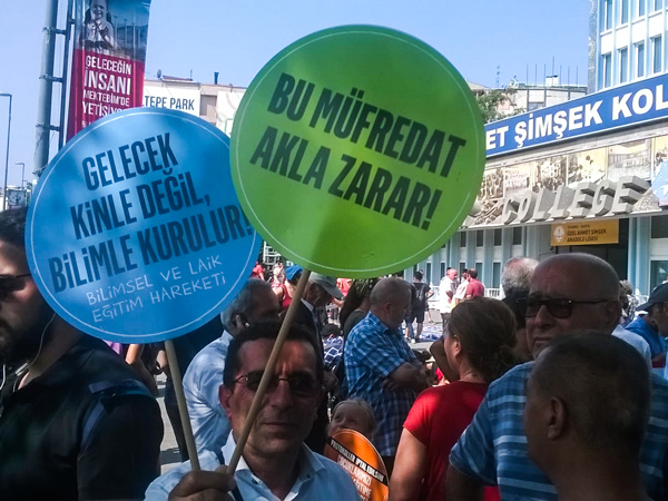 Üç dakikalık “sessiz eylem” çağrısının ardından ABF ve Eğitim Sen adına ortak metni sanatçı Orhan Alkaya okudu. Gerici, anti-bilimsel, anti-laik eğitim müfredatı ile gericiliğin, cihatçılığın eğitimde hâkim kılınmaya çalışılmasının teşhir edildiği açıklamada bu saldırılara karşı herkes mücadeleye çağrıldı.