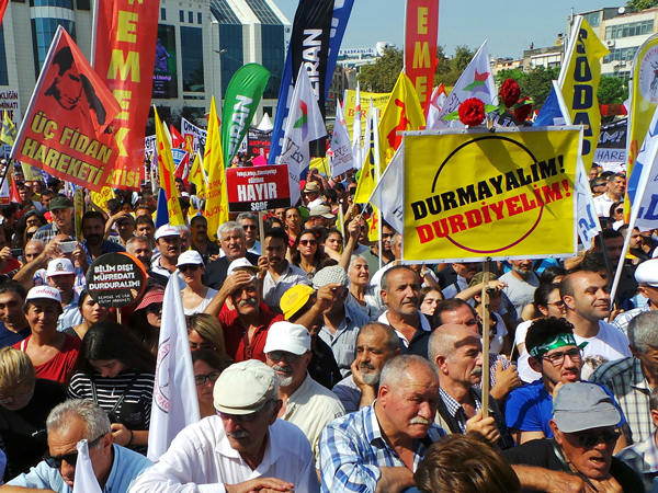 - Beş bine yakın kişinin katıldığı mitingde ağırlıklı olarak Alevi emekçiler yer aldı.