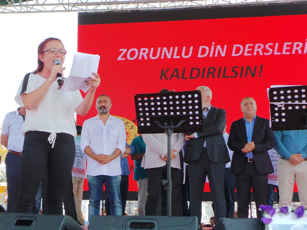 Gerici eğitim müfredatıyla atılmak istenen adımları teşhir eden Aydoğan, Erdoğan’ın ‘TEOG kaldırılsın’ demesine, eğitim sisteminde sürekli değişme yaşanmasına ve sınav sistemine tepki gösterdi. Aydoğan mücadele çağrısı yaparak yarın herkesi il milli eğitim müdürlükleri önlerine çağırdı. “KESK ve Eğitim Sen’liler olarak OHAL’e, KHK’lara, AKP faşizmine, gericiliğine, karanlığına teslim olmayacağız. Bu daha başlangıç mücadeleye devam” diyerek konuşmasını sonlandırdı.