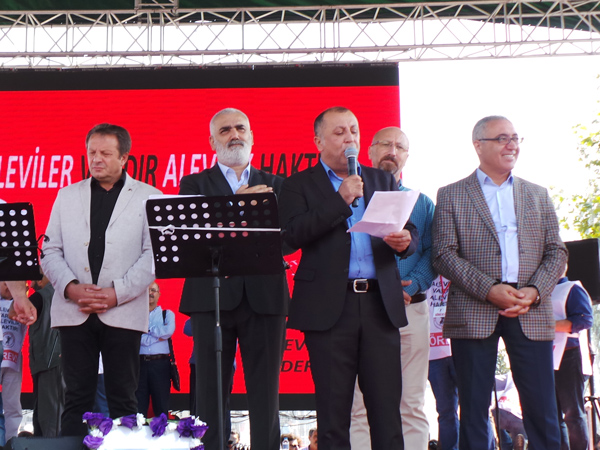 “Cemevleri ibadethanemizdir”, “Gerici şeriatçı eğitime hayır”, “Çağdaş, bilimsel laik eğitim istiyoruz” dövizlerinin taşındığı yürüyüşte, “Irkçı, gerici eğitime hayır!”, “Susma sustukça sıra sana gelecek!”, “Gün gelecek devran dönecek AKP halka hesap verecek!”, “Faşizme karşı omuz omuza!” sloganları atıldı. Kitlenin tamamının alana girmesinin ardından “hak hukuk adalet mücadelesinde ölümsüzleşen canlar için” saygı duruşu ile miting programı başladı.