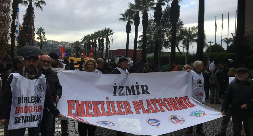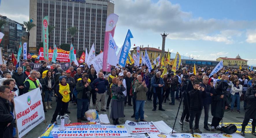 Kamu Emekçileri Sendikası Konfederasyonu (KESK) İzmir’de bölgesel miting gerçekleştirdi. “Geçinemiyoruz! Halk İçin Bütçe, Demokratik Türkiye” pankartı arkasında toplanan KESK’e bağlı sendikalar ve diğer imzacılar (Türk-İş, TMMOB, İzmir Barosu ve İzmir Tabip Odası) Konak SGK önünden Cumhuriyet Meydanına yürüyüş gerçekleştirdi.