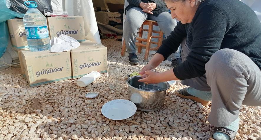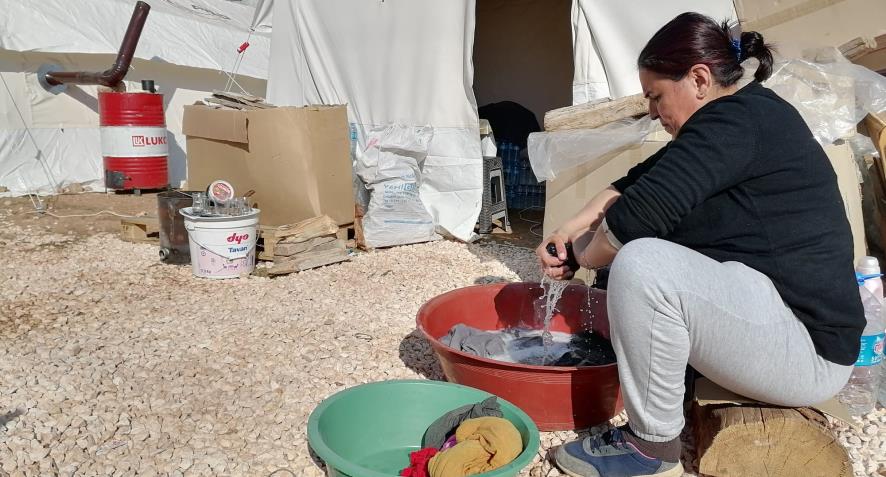 “Temizlik ile sorun yaşıyoruz. Tuvalet vb. geldi, günlerce banyo yapamadık. Şimdi leğenlerde yapmaya çalışıyoruz. Su biterse diye kaygılanıyoruz. Biz alışığız ama genç kızlarımız var. Onlar böyle bir şey görmediler. Soba yakıyoruz, is, pis duman içinde kalıyoruz. Çamaşırı elimizde yıkıyoruz. Bu da sorun değil ama nereye kadar böyle devam edecek."