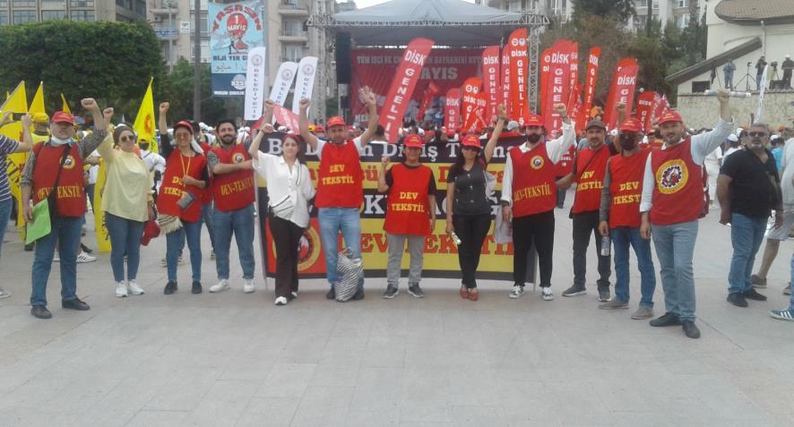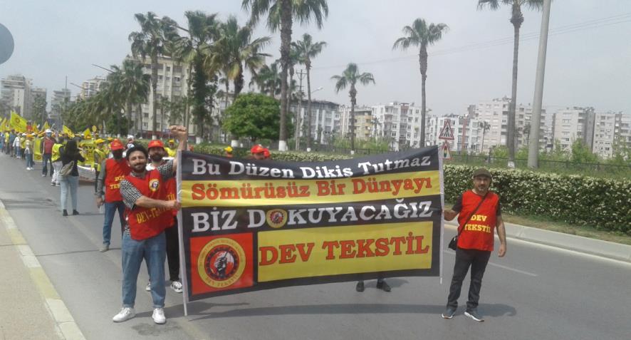 “Tekstil işçilerinin haklı davasını veren Devrimci Tekstil İşçileri Sendikası geliyor. İnsanca çalışma ve yaşama koşulları için köle kamplarına dönen tekstil fabrikalarında örgütlenme çalışmalarını sürdüren DEV TEKSTİL geliyor. Sermayeye kefen çocuklarımıza aydınlık günler dokuyan devrimci tekstil işçileri geliyor. Bu düzen dikiş tutmaz, sömürüsüz bir dünyayı biz dokuyacağız diyen DEV TEKSTİL geliyor”.
