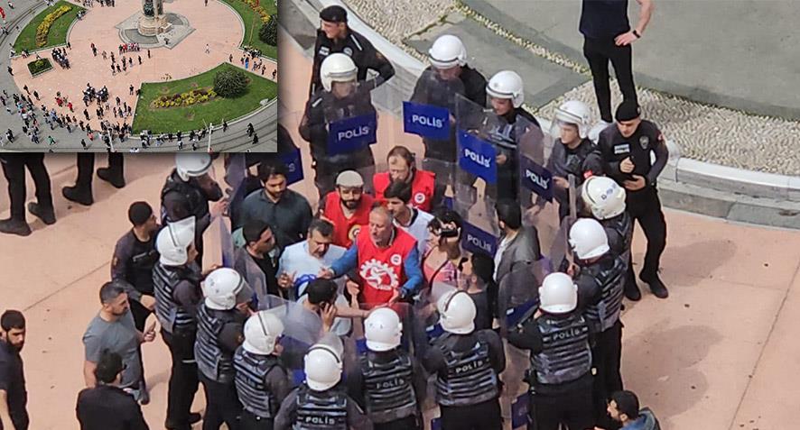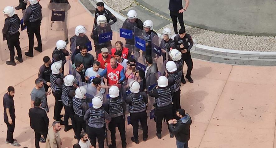 Açıklama polis tarafından engellenmeye çalışıldı. Açıklama yapan sendikalar ablukaya alındı ve alıkonuldu.