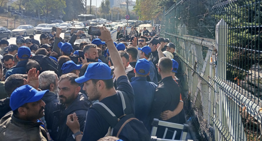 TPI işçileri bugün (17 Ekim) otobüslerle Ankara’ya geldi. TPI işçileri bakanlık bahçesine doğru yürümek istedi ve işçilerin önüne polis barikatı kuruldu.