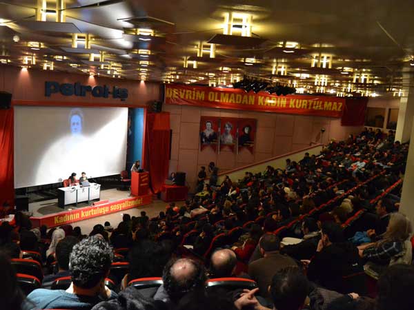 Birçok konunun yanısıra kadınların kapitalist toplumda tam olarak özgürleşmesinin mümkün olmadığına, bunu ancak sosyalizmin başarabileceğine, Ekim devriminde çıkarılan ilk yasaların kadınlarla ilgili olduğuna vurgu yapan konuşmalar gerçekleştirildi.