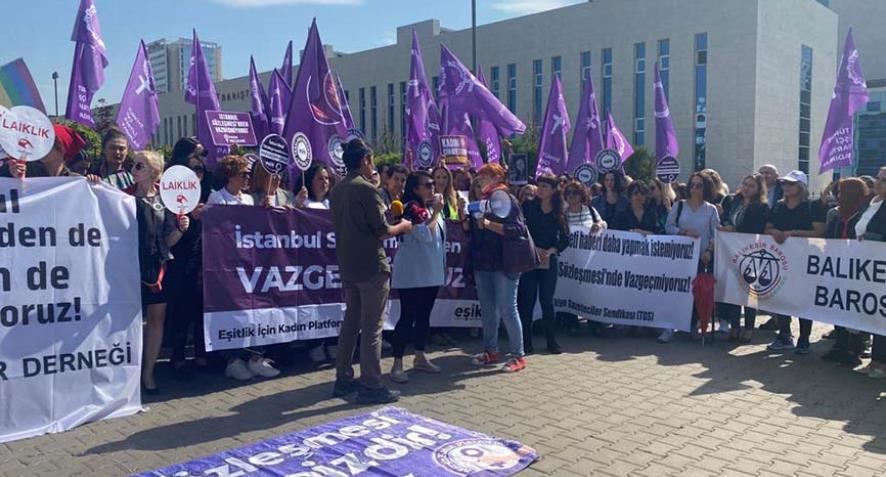 “Bin bir emekle inşa ederek elde ettiğimiz kazanımlarımızı hukuksuzca gasbetmenize izin vermeyeceğiz. Faillerden ve onları koruyan erkek devletten de hesap sormaya devam edeceğiz. Bizleri yoksullukla, şiddetle, tacizle cezalandırmaya, haklarımızdan vazgeçmeye zorlamanızı kabul etmiyoruz. Bizlerin yaşamları sizlerin korunaklı adliye salonlarınızdan, saraylarınızdan verdiğiniz kararlara bağlı olmayacak. Katillerini ödüllendirdiğiniz her bir kadının isyanıyla mücadelemizden, ısrarımızdan, inadımızdan asla vazgeçmeyeceğiz. İstanbul Sözleşmesinde vazgeçmeyeceğiz.”