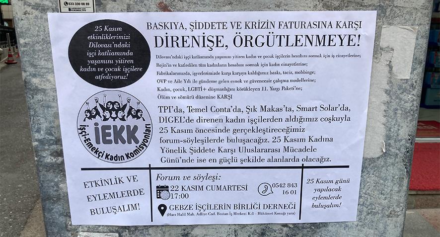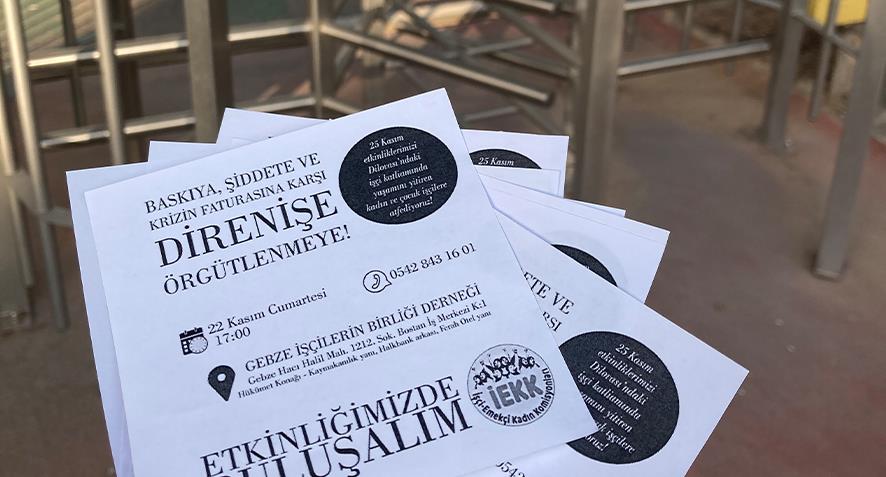 Gebze’de kadın işçilerin yoğun olduğu Smart Solar grevi başta olmak üzere devam eden direniş ve grevleri işleyen, Dilovası'ndaki işçi katliamını konu alan, etkinlik bilgilendirmesinin olduğu duvar gazeteleri yapan İEKK, kadınların yoğun olduğu metal fabrikalarına da el ilanı dağıttı.