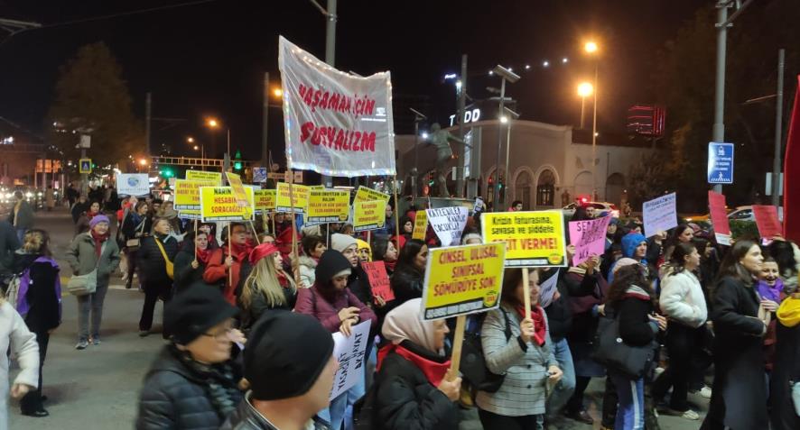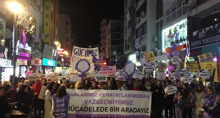 İzmir Kadın Platformu’nun çağrısıyla saat 19.00’da Alsancak Garı önünde toplanan yüzlerce kadın baskıya, şiddete ve gericiliğe karşı tepkisini ortaya koydu ve dünyanın dört bir tarafında direnen kadınlara selam gönderdi. Geçtiğimiz yıllara göre daha kitlesel bir katılımın olduğu 25 Kasım eyleminde kadınlar “Haklarımızdan ve hayatlarımızdan vazgeçmiyoruz! Mücadelede bir aradayız!” şiarlı pankart taşıdı. Pankartın arkasında çeşitli kadın örgütleri kendi dövizleriyle yürüyüşteki yerini aldı.